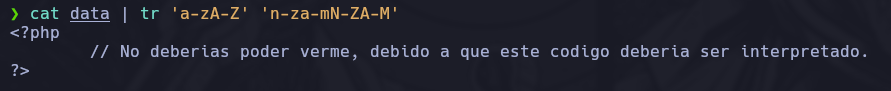 Todo esto podemos copiarlo, meterlo en un archivo llamado ‘data’ y decodificarlo en nuestra shell de la siguiente manera cat data | tr 'a-zA-Z' 'n-za-mN-ZA-M'
