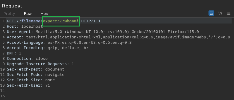 Algo a tener en cuenta que hay mucha variedad de Wrappers, hay uno llamado Expect que es interesante ya que si colocamos en el Burpsuite en el apartado de la petición por GET lo siguiente GET /?filename=expect://whoami, podríamos llegar a intentar ejecutar comandos de manera remota (RCE), pero en este caso no funciona porque no está habilitado.