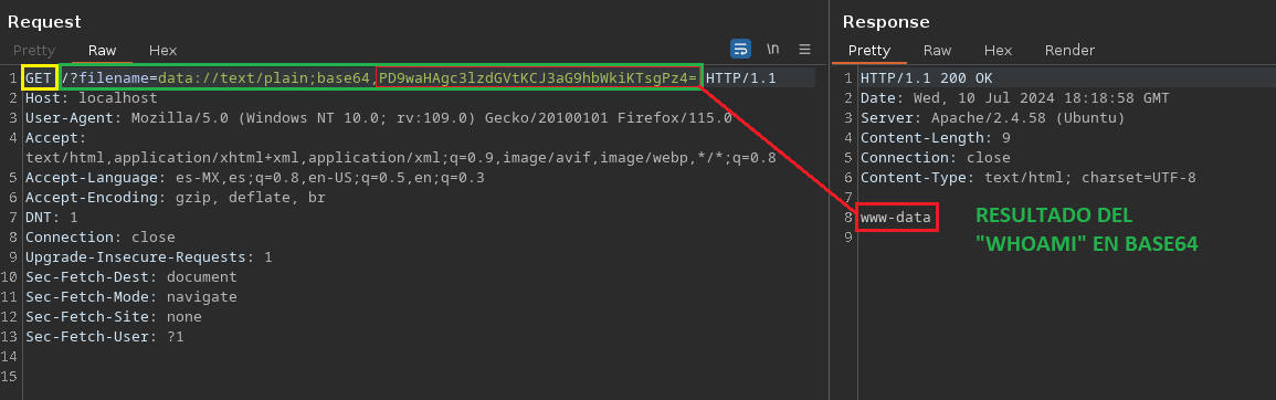 Otro Wrapper existente para RCE es data://text/plain;base64,(código-en-base64), debiendo cambiar la petición a GET. Con este Wrapper por ejemplo podemos enviar una cadena con un código php en base64 para que sea decodificado y a la vez interpretado, dándonos así el resultado del comando que ejecutemos.