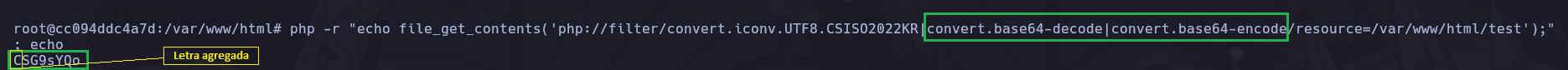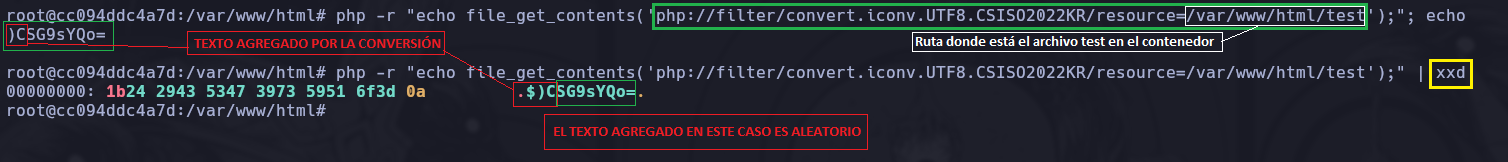 En cuanto a encoding respecta podemos utilizar diferentes conversiones que podríamos aplicar a nivel de tratamiento de caracteres, uno de ellos es por ejemplo el siguiente convert.iconv.UTF8.CSISO2022KR, acá estamos diciendo que de UTF8 lo pasaremos a CSISO2022KR que es el tipo de encoding que vamos a aplicar (Hay muchos tipos que veremos mas adelante con una herramienta). Todo quedaría tal que así php://filter/convert.iconv.UTF8.CSISO2022KR/resource=, nosotros al hacer esto veremos que se están agregando caracteres adelante de la cadena nuestra, podemos verlo con un echo o con xxd