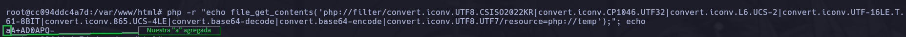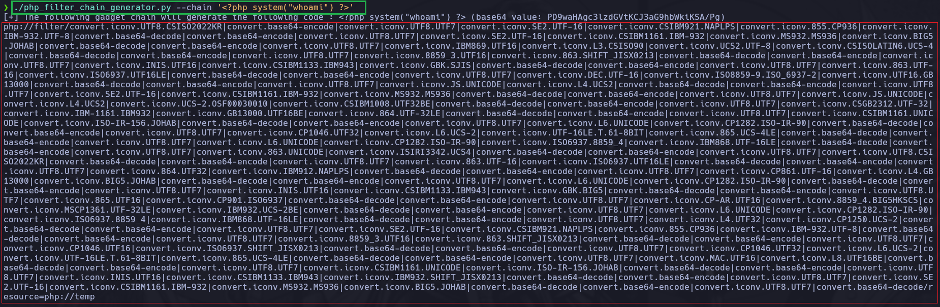 • php -r "echo file_get_contents('php://filter/convert.iconv.UTF8.CSISO2022KR|convert.iconv.CP1046.UTF32|convert.iconv.L6.UCS-2|convert.iconv.UTF-16LE.T.61-8BIT|convert.iconv.865.UCS-4LE|convert.base64-decode|convert.base64-encode|convert.iconv.UTF8.UTF7/resource=php://temp');"; echo