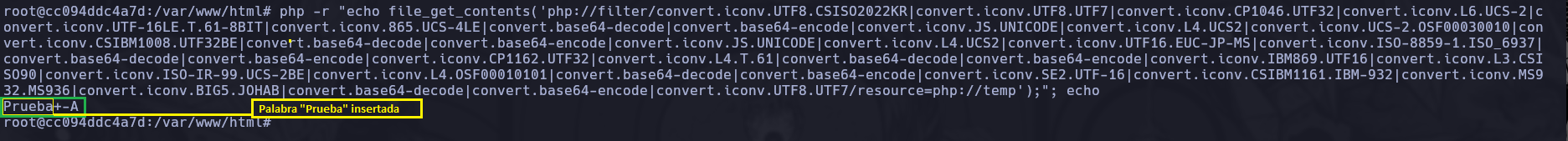 Utilizaremos el siguiente recurso https://github.com/synacktiv/php_filter_chain_generator para ver cada carácter con su respectiva conversión, por lo tanto podríamos ir copiando que encoding representa a cada letra que queramos utilizar, en este caso a modo de ejemplo colocaremos la cadena “Prueba”.