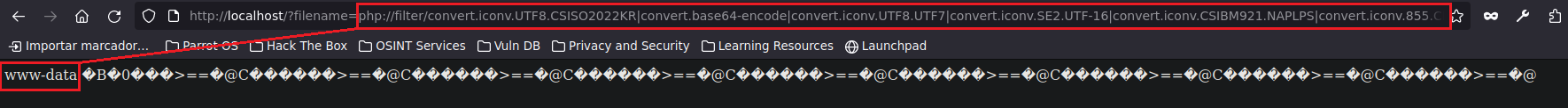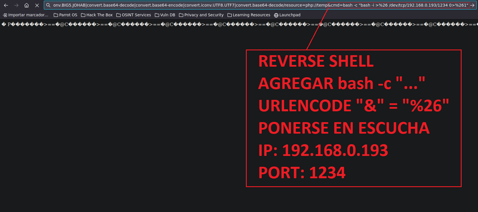 • [.5.] Luego a la derecha del encoding colocamos una PIPE y agregamos el Wrapper que evita el conflicto con los == por las dudas (ESTE WRAPPER SIEMPRE IRÁ A LA DERECHA DEL TODO Y AL PRINCIPIO LUEGO DEL CSISO2022KR), todo esto quedaría así php://filter/convert.iconv.UTF8.CSISO2022KR|convert.iconv.CP1046.UTF32|convert.iconv.L6.UCS-2|convert.iconv.UTF-16LE.T.61-8BIT|convert.iconv.865.UCS-4LE|convert.base64-decode|convert.base64-encode/resource=php://temp