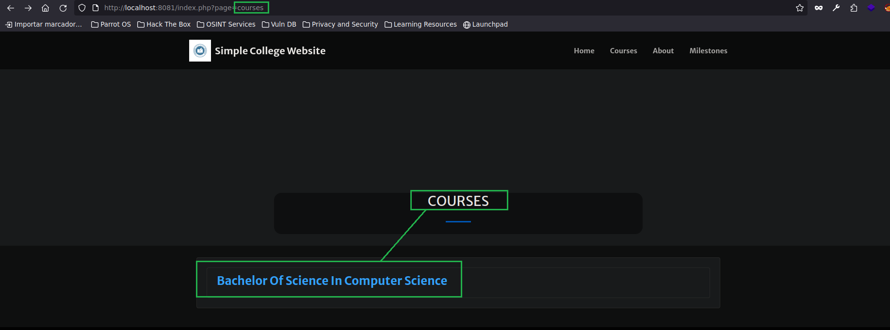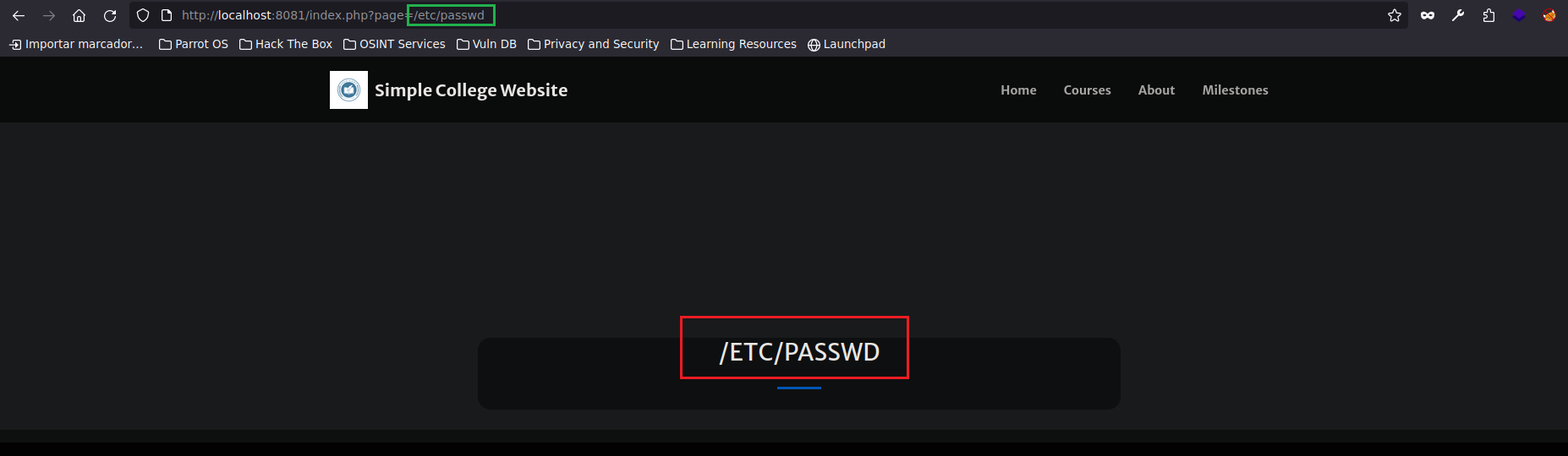 Una vez ingresamos a la web veremos un portal de lo que parece ser una escuela, prestaremos atención al URL ya que parece que al movernos por las diferentes pestañas (Home, About us, Courses, etc) está llamando a un archivo, si nosotros borramos lo que sigue luego de page= y colocamos otra cosa, veremos que sucede http://localhost:8081/index.php?page=/etc/passwd.