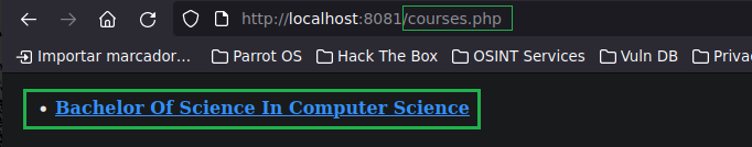Solo nos está interpretando la ruta pero no nos lista el contenido, no está siendo ejecutada como tal. Ahora probemos ir por ejemplo a Courses otra vez. Veremos que arriba pone page=courses pero esa sección si tiene contenido, un documento llamado “Bachelor Of Science In Computer Science”, por lo tanto está siendo ejecutada, por lo que podemos deducir que debe tener algún tipo de extensión.