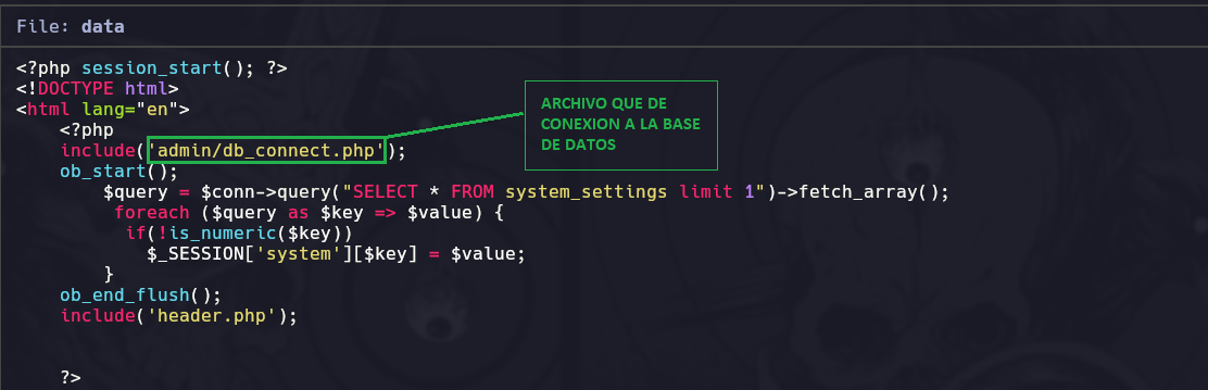 Una vez abierto el archivo data que posee el contenido del index.php podemos investigar si hay alguna sección del código que incluya a otro archivo que se vea “valioso”.