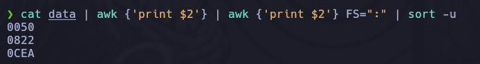 • cat data | awk {'print $2'} | awk {'print $2'} FS=":" | sort -u