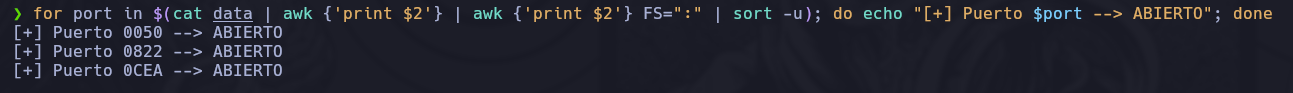 • for port in $(cat data | awk {'print $2'} | awk {'print $2'} FS=":" | sort -u); do echo "[+] Puerto $port --> ABIERTO"; done