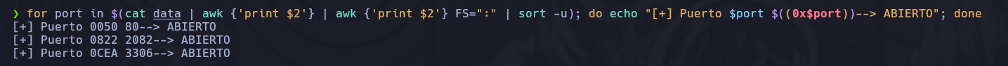 • for port in $(cat data | awk {'print $2'} | awk {'print $2'} FS=":" | sort -u); do echo "[+] Puerto $port $((0x$port))--> ABIERTO"; done