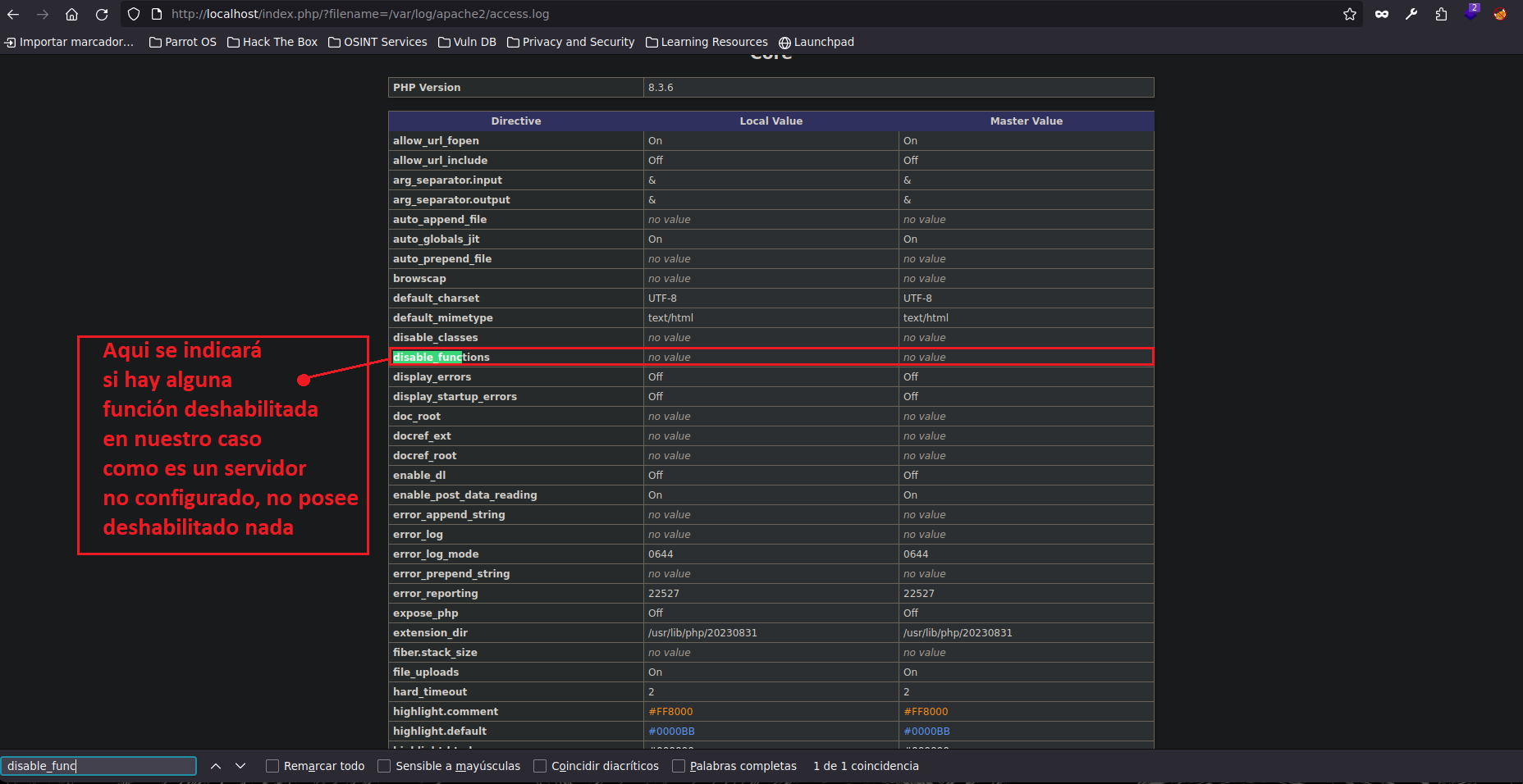 Ahora debemos filtrar con CTRL+F por “disable_functions”. Siempre es interesante ver esta tabla una vez que podamos inyectar código malicioso php en una web, ya que nos dará mucha información que nos puede ser de utilidad.