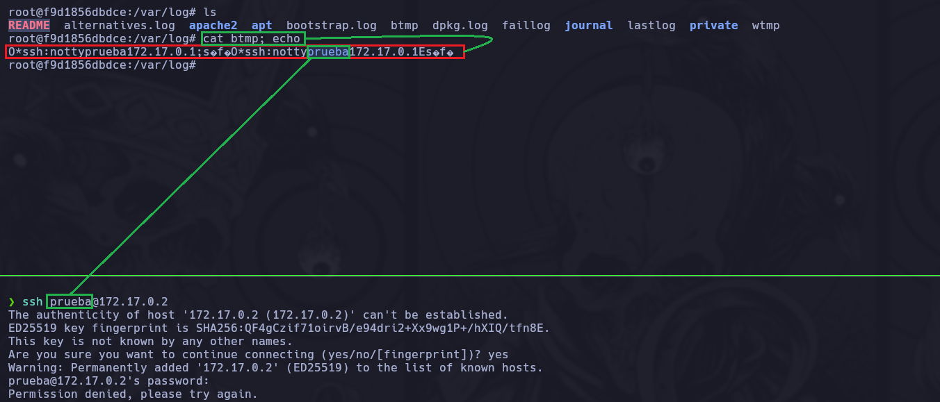 Primero a modo de prueba en la terminal estaremos dentro del contenedor en el directorio /var/log/ para ver el comportamiento del archivo btmp, luego en otra terminal enviaremos un intento de conexión por SSH hacia la IP del contenedor. Ahora revisaremos el archivo btmp para ver si quedó registrado nuestro intento de conexión por SSH.