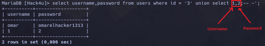 En la siguiente imagen estamos filtrando por dos columnas, la columna username, y la columna password, por ende deberíamos colocar en el union select lo siguiente Haciendo referencia con el 1 a la primera columna y con el 2 a la segunda columna, y de esta manera sería sucesivamente si hubiera aun mas columnas Siempre separado por ",".