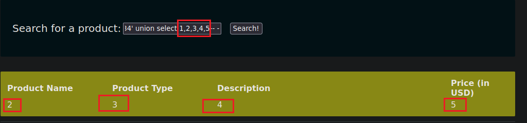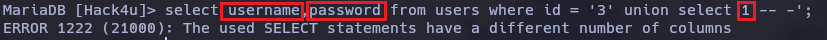 Es importante tener en cuenta que si hubiera mas de una columna, y colocamos el numero erróneo, el union select lanzará un error de la siguiente manera, por no coincidir con el numero de columnas.