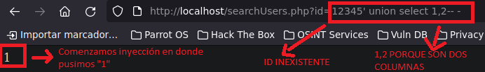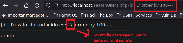 En la linea select username from users where id = '$id' dentro del script en donde dice '$id' es donde colocaríamos nuestro input pero desde la URL y como vemos está encerrado entre comillas simples. A causa de esto podríamos aprovecharnos y en vez de colocar 1 por ejemplo, podríamos colocar una comilla simple luego del numero tal que así 1’, de esta manera estaríamos cerrando la query pero habría una comilla simple de más que se quedaría colgando o sola, lo que causaría que se acontezca un error en la base de datos haciendo que la query se corrompa ENVIANDO O NO dependiendo de como esté configurado, un mensaje de error en la web, en este caso no nos dará ningún error, simplemente quedará en blanco. Algo a tener en cuenta, es que nosotros todo esto lo estaríamos haciendo dentro del URL, por ende la sintaxis con la comilla de más quedaría tal que así: http://localhost/searchUsers.php?id=1'