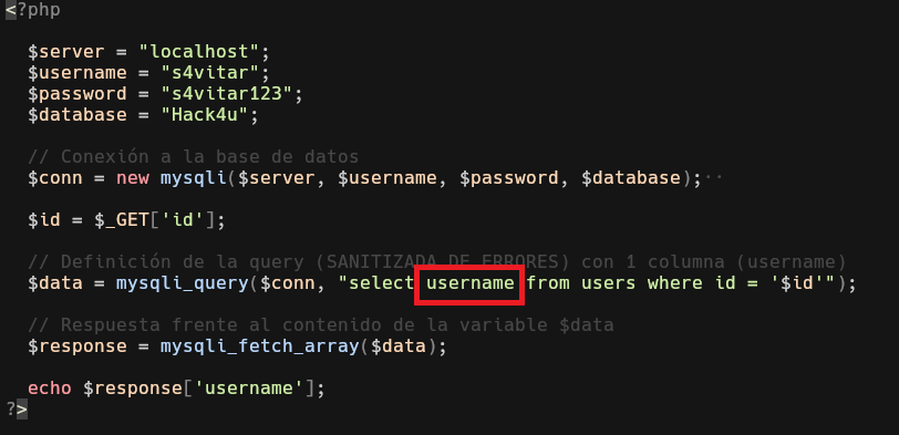 Ahora lo que debemos hacer es indicar que dependiendo del numero de identificador de usuario que coloquemos, nos brinde el nombre del usuario correspondiente a ese identificador. Para esto creamos una variable data que va a tramitar una query o petición a través de la conexión establecida por la variable conn para ubicar la columna username dentro de la tabla users donde el id sea igual al que coloquemos dentro del parámetro id en la URL para que nos muestre el nombre del usuario correspondiente a ese identificador en la web. Esto se consigue gracias a que el parámetro id estará buscando dentro de la base de datos una coincidencia frente al numero que coloquemos, si coincide con el id de un usuario, nos mostrara que usuario posee ese identificador.