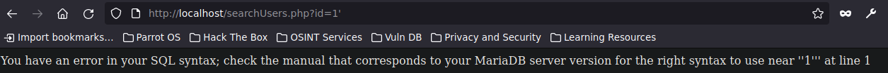 De esta forma nos aparecería el siguiente error luego de intentar ingresar a la URL http://localhost/searchUsers.php?id=1'