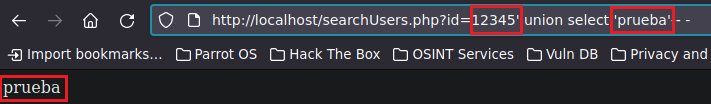 Recomendamos que en vez de colocar en la web un identificador de usuario existente (Que en nuestro caso poníamos ?id=3’), coloquemos uno que no exista, para que solo nos muestre la fila agregada por nosotros, por ejemplo ?id=12345’ y en el union select ‘prueba’ en vez de 1.