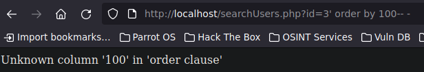Al encontrar que no existe la columna colocada, debemos ir bajando poco a poco el valor hasta averiguar cuantas existen, básicamente estamos haciendo FUZZING. En este caso nosotros sabemos que existen tres columnas ya que las creamos nosotros previamente, pero cuando en order by 100, coloquemos el valor 3 dentro de la URL, no nos va a brindar que existen tres columnas, ya que dentro del script de la base de datos, el parámetro ID está asignado a una columna sola la cual es la columna ID, por ende solo nos detectará si colocamos el valor 1.