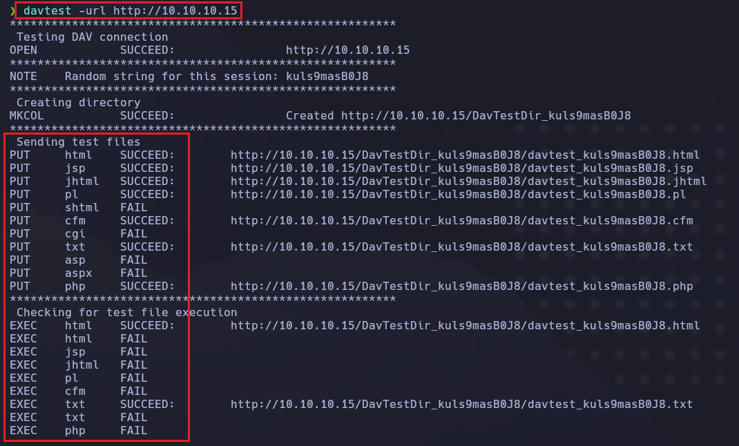 Descubrimos que en la web están habilitados diferentes tipos de métodos HTTP, entre ellos TRACE DELETE COPY MOVE PROPFIND PROPPATCH SEARCH MKCOL LOCK UNLOCK PUT, por lo tanto podríamos intentar jugar con estos manualmente o utilizar la herramienta davtest --url <url> para que esta realice el chequeo de cuales son los archivos que pueden subirse.