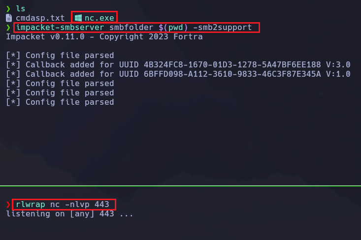 • impacket-smbserver smbfolder $(pwd) -smb2support Terminal 1 ofreciendo el nc.exe.