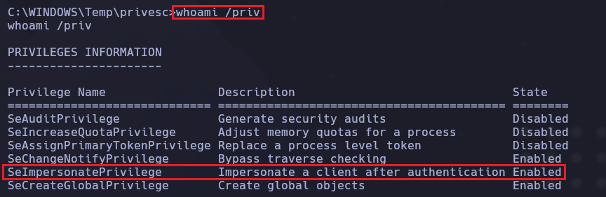 • Si hacemos un whoami /priv veremos los privilegios actuales del sistema.