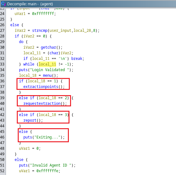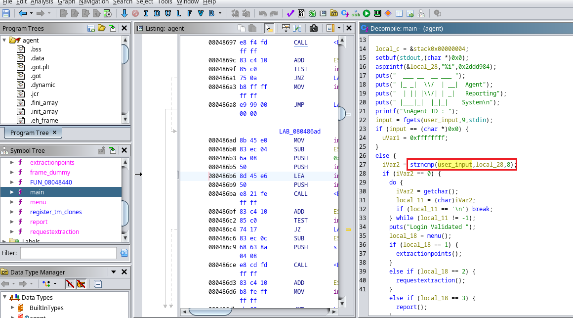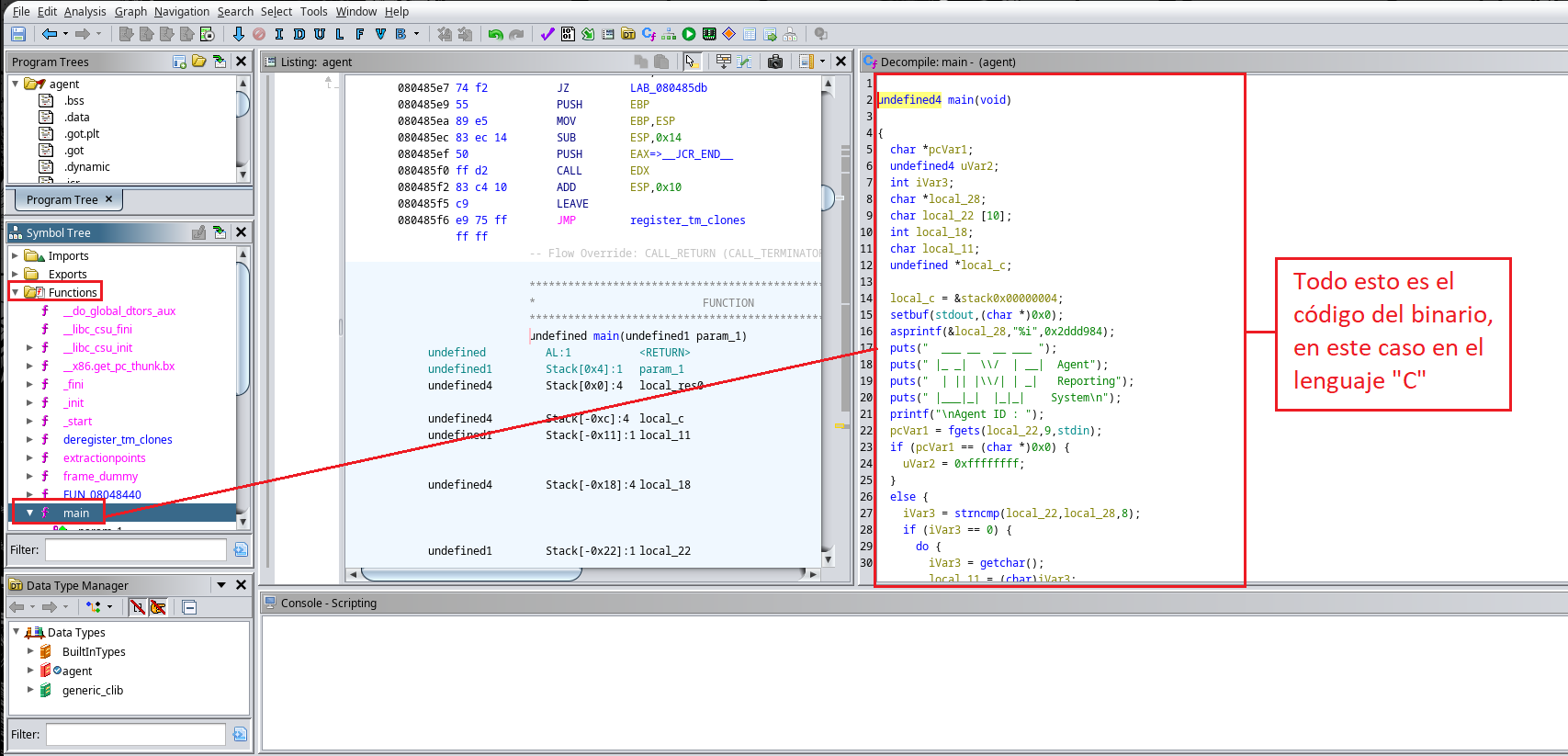 Analizaremos el código porque queremos ver como está estructurado para en caso de que detecte un posible Buffer Overflow, algún punto de inyección de comandos o por ejemplo el Agent ID que nos pide el binario agent al ser ejecutado, poder manipular todo correctamente ya que la herramienta Ghidra es más interactiva a nivel visual.