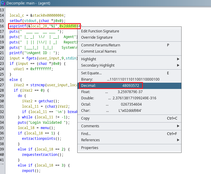 Por lo tanto si miramos más arriba que es donde se definen algunos valores veremos que hay una función llamada asprintf(&local_28,"%i" ,0x2ddd984) que contiene a local_28 y luego una cadena en hexadecimal, si nosotros damos click derecho en esa cadena podremos cambiar su valor a decimal, por lo tanto tendríamos el valor de local_28, es decir el valor que precisamos para pasar la autenticación.
