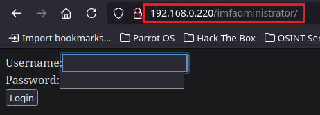 gobuster dir -w /usr/share/SecLists/Discovery/Web-Content/directory-list-2.3-medium.txt -u http://192.168.0.220/imfadministrator/ -t 10