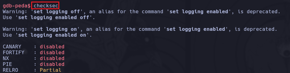 Procederemos a indagar más acerca de la información del binario, en este caso el binario no posee protecciones activas por lo que vimos con el comando checksec dentro de gdb.