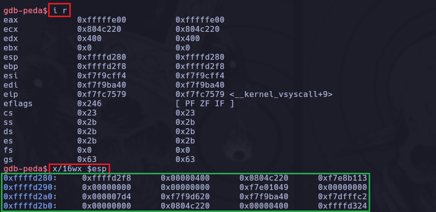 Dentro del gdb podemos analizar el binario con i r o con info registers que es lo mismo, por lo tanto con la información que nos brinda este comando vamos a indagar en el registro ESP.