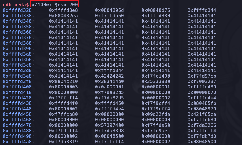 Lo que necesitamos hacer para poder ver los caracteres que colocamos nosotros en la Pila es realizar un x/100wx $esp-200 que significa listar 100 palabras de la memoria pero restándole 200 para ver 200 Bytes antes de esas 100 palabras, de esta forma veremos varias direcciónes que contemplan 41414141 es decir nuestros caracteres correspondientes a la letra “A”.