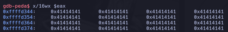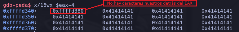 Vamos a observar el registro EAX con x/16wx $eax y veremos que nuestras “A” figuran a la primera, ahora por ejemplo listemos 4 Bytes antes con x/16wx $eax-4 y veremos que nuestras “A” ya no están.
