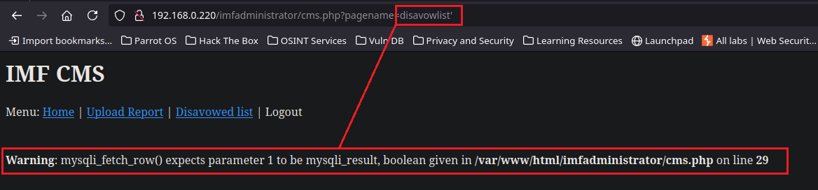 Una vez dentro encontramos una sección llamada Disavowed list, que además de ser extraña notamos que las URL’s de cada sección se indican a través del parámetro pagename= por lo tanto probaremos una inyección SQL ahí.