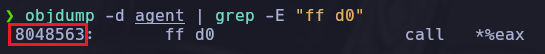 Una vez tengamos el Opcode de call eax para conseguir su dirección estática podemos aplicar un objdump -d agent | grep -i "ff d0" el parámetro -d viene de descompilar.