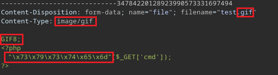 ?>En mi caso conseguí subir este archivo cambiando el Content-Type, modificando la extensión y los primeros bytes del archivo (Magic numbers), además algo extra que noté es que el WAF (Firewall web) detectaba mi código malicioso debido al uso de la función system propia de php, por lo tanto emplee una forma de bypassear esa detección colocando la cadena system en hexadecimal.