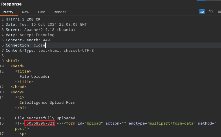 Ahora lo que hice fue intentar buscar mi archivo en el directorio /uploads que detecté previamente con fuerza bruta pero no lo encontré por lo tanto busqué si había alguna pista que indique que mi archivo haya sido renombrado.