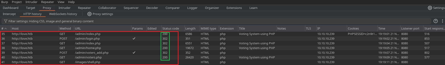 callShell()Cabe destacar que añadí una variable burp = {'http': 'http://127.0.0.1:8080'} antes de la request, y luego se agregó otra variable s.proxies = burp luego de la request, esto lo hice para poder ver como el script envía las peticiónes a través de Burpsuite en el HTTP History de la herramienta.